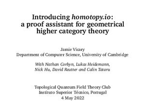 Weak higher categories can be difficult to work with algebraically, with the weak structure potentially leading to considerable bureaucracy. Conjecturally, every weak $\infty$-category is equivalent to a "semistrict" one, in which unitors and associators are trivial; such a setting might reduce the burden of constructing large proofs. In this talk, I will present the proof assistant homotopy.io, which allows direct construction of composites in a finitely-generated semistrict $(\infty,\infty)$-category. The terms of the proof assistant have an interpretation as string diagrams, and interaction with the proof assistant is entirely geometrical, by clicking and dragging with the mouse, completely unlike traditional computer algebra systems. I will give an outline of the underlying theoretical foundations, and demonstrate use of the proof assistant to construct some nontrivial homotopies, rendered in 2d, 3d, and in 4d as movies. I will close with some speculations about the possible interaction of such a system with more traditional type-theoretical approaches. (Joint work with Nathan Corbyn, Calin Tataru, Lukas Heidemann, Nick Hu and David Reutter.)