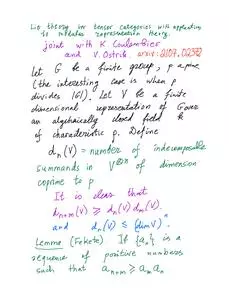 For example, what can we say about the number $d_n(V)$ of summands with dimension coprime to $p$? It is easy to show that there is a finite limit $d(V) := \lim_{n \to \infty} d_n(V)^{1/n}$, but what kind of number is this? Is it algebraic or transcendental? Until recently, there were no techniques to solve such questions (and in particular the same question about the sum of dimensions of these summands is still wide open). Remarkably, a new subject which may be called "Lie theory in tensor categories" gives methods to show that $d(V)$ is indeed an algebraic number, which moreover has the form \[ d(V) = \sum_{1 \leq j \leq p/2} n_j(V)[j]_q, \] where $n_j(V)$ is a natural number, $q := \exp(\pi i/p)$ is a particular root of unity, and $[j]_q := \frac{q^j-q^{-j}}{q-q^{-1}}$ is a $q$-number. Moreover, $d(V \oplus W) = d(V) + d(W)$ and $d(V \otimes W) = d(V) d(W)$, so $d$ is a character of the Green ring of $G$ over $k$. Finally, $d_n(V) \geq C_V d(V)^n$, for some $0 < C_V \leq 1$, and we can give lower bounds for $C_V$. In the talk, I will explain what Lie theory in tensor categories is and how it can be applied to such problems. This is joint work with K. Coulembier and V. Ostrik.